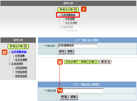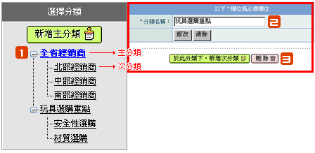 自訂頁面最多可建立到二層分類選項,您可在此新增、修改、刪除主分類和次分類選項。 |