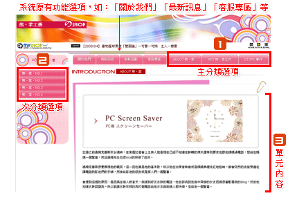 自訂頁面流程:先在此建立分類【一層或二層】→ 再至分類下建立相關內容。